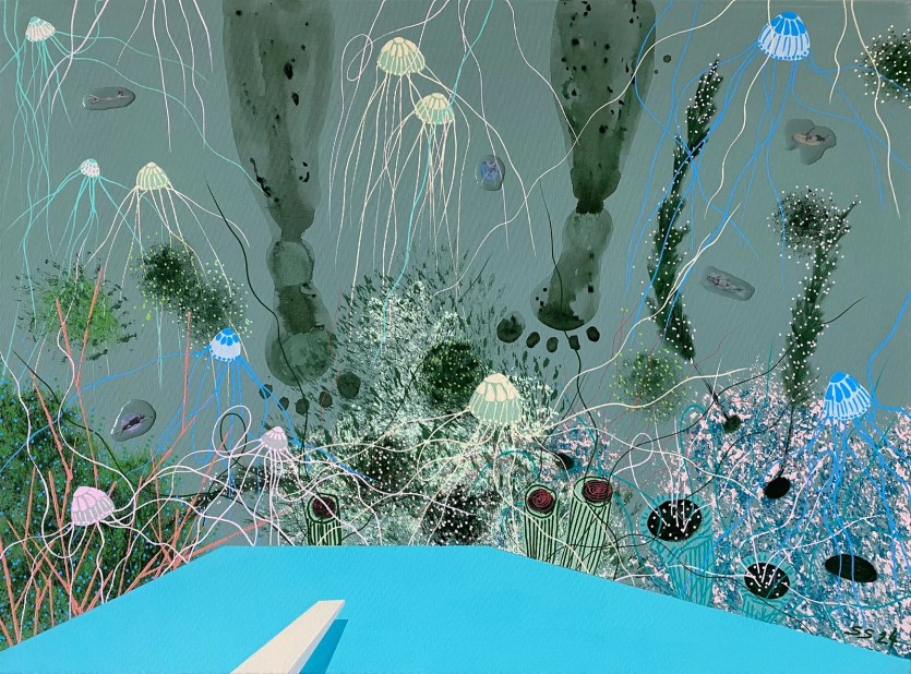 캔버스에 아크릴, 수성 페인트 및 안료