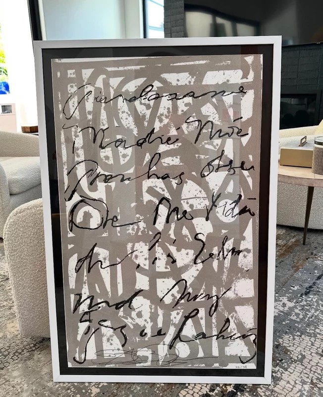 RETNA는 Marquis Lewis라는 본명으로 비밀 언어를 연상시키는 길고 기하학적인 글씨로 덮인 대형 그림으로 유명합니다. 작가의 모양은 이집트 상형 문자, 아랍어와 히브리어 서예, 고딕 블랙레터, 그래피티 등 전 세계적인 영향에서 영감을 받았습니다. RETNA는 로스앤젤레스에서 자라면서 그래피티 아티스트로 시작했습니다. 그 후로 뉴욕, 로스앤젤레스, 런던 등 여러 도시에서 작품을 전시했습니다. 그의 작품은 2차 시장에서 정기적으로 5자리 수에 판매됩니다. RETNA는 Louis Vuitton, Nike, Chanel 등의 브랜드와 협업했으며, Justin Bieber의 앨범 커버를 제작했고, Washington National Opera와 San Francisco Opera에서 Aida를 공연하기 위한 세트를 디자인했습니다.