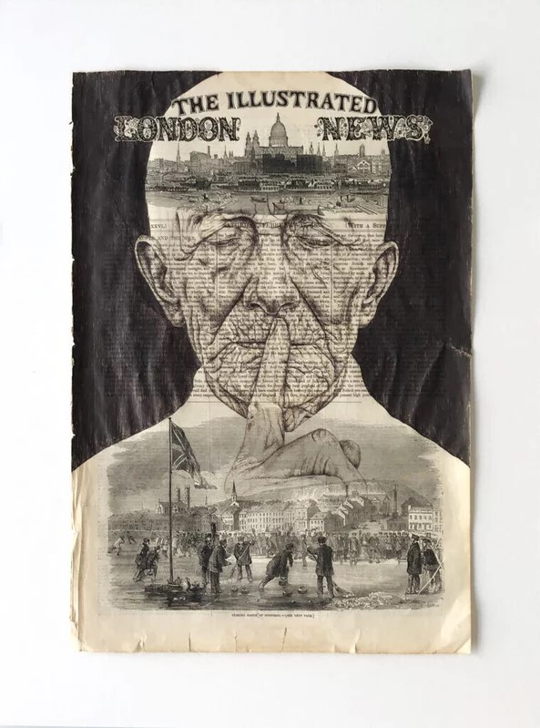 17세기 로 거슬러 올라가는 오래된 지도 , 카드 놀이, 보드 게임 , 정기 간행물, 골동품 문서를 캔버스로 삼은 Mark Powell은 역사에 대한 뚜렷한 감각을 불러일으키는 눈부시고 정교하게 세부 묘사된 펜과 잉크 초상화를 제작합니다 . 단순한 Bic 볼펜만을 사용하여 Powell은 거의 항상 익명의 노인 캐릭터인 피사체를 틀림없는 정밀함으로 그려 모든 선과 주름을 포착하면서 깊이 있고 개인적인 삶의 이야기를 불러일으 킵니다. 그는 피사체와 그들이 묘사된 소재 사이에 연상적이고 종종 섬뜩한 대화를 만듭니다. 그의 작품 중 다수는 서사적으로 모호하지만, American Tourists (2020) 에서 맨해튼 섬 지도 위에 나이 든 아메리카 원주민의 이미지를 중첩한 것처럼 다른 작품에는 사회적 논평 의 틀림 없는 밑바탕이 있습니다.
